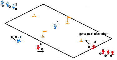 Player 1 starts in goal. Player A dribbles at speed to cone, stops the ball and shoots with the next step. After the shot, player A runs to become the new keeper waiting for player 2 to shoot. Player 1 gets ball and goes back to his side.