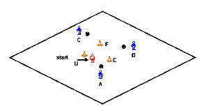 Player A rolls ball towards E (No emphasis on scoring!), keeper dives and stops ball, returning it to player A as quickly as possible and then gets into position at E .