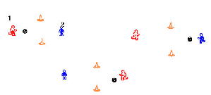 Two players per gate. The gates are approximately two steps apart. One ball per group. First player must play the ball on the ground through the gate to second player. Second player must recieve and play back through the gate within two touches. The game continues until players can not get ball back through the gate on the ground within two touches.