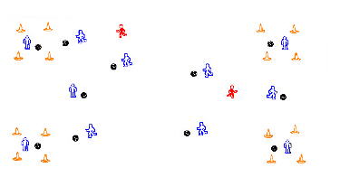 INDIVIDUAL OR SMALL GROUP ACTIVITIES: Follow the warm-up with some kind of individual activity, not a real 1v.1 game, but some kind of activity where players act as individuals in a game environment. An example would be a kind of tag game, or a game where players are trying to work with a partner or small group to obtain a goal. Keep players in motion at all times. Avoid having them wait on lines. Play games of "inclusion" (where everyone plays), instead of games where the "looser sits". Be creative. These players like "crazy" games with a lot of action.