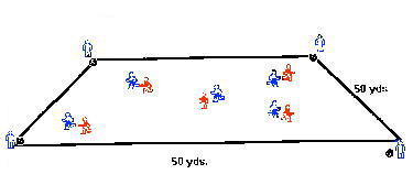 The Game Create a 5 - 10 yard neutral area that no player can enter. Use a minimum of one ball per two players (for best results, use a ball for each player). On command, each team tries to keep it's side free of balls by kicking through the neutral zone to the opposite side. Play for a specific time limit.