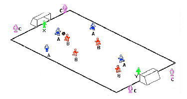 Three teams of 4 (A, B, C) and two keepers (X, Y). Team A attacks against keeper Y. If they score, they then quickly try to attack keeper X. At this time, team B leaves the field and takes the place of team C who were the supporting players on the endlines, supporting both teams. The supporting players support for both teams and can move along the end line. The are limited to one touch one the ball. Have an ample aupply of balls ready in each net.