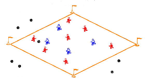 Seven players try to possess the ball. 15 passes equals 1 goal. 4 players are collectively trying to gain possession and get the ball out of the space. One goal each time they get it out. 3 points wins the game