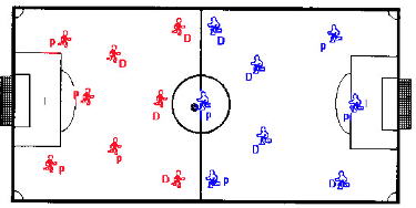 Two equal teams on a regulation field. Divide each team: half are dribblers (with a maximum of 5 touches before they