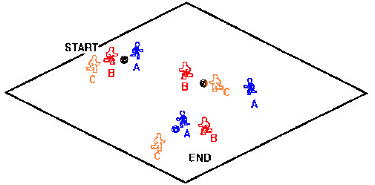 the ball. Player B must try to follow the head of the snake, Player A. Player C